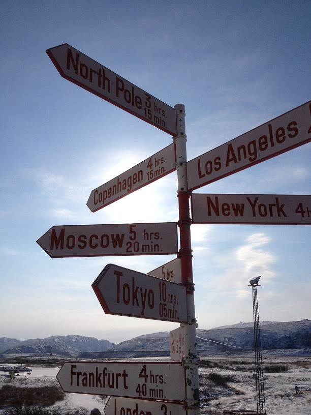 Kangerlussuaq directions to the world. Shack ison the moutain in the back .