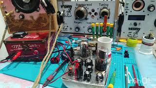 It is using tube 6SK7 tube for the regen Receiver and a 12V6 tube for the TX. Output power is about 10w but tonight i am using a tiny tube smplifier providing about 110w For the TX , It is crystal controlled , no VFO and currently for the 40m I have 12 (twelve) FT-243 crystal . No chirp , the TX is pretty much clean thanks to PI tank at the output
