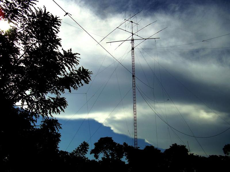 An A3S 20-15-10Mts at 60 ft, On top 6Mts 3el quad, A wire fix direction 30 deg 40Mts 2 el quad and some dipoles & Sloper dipoles.